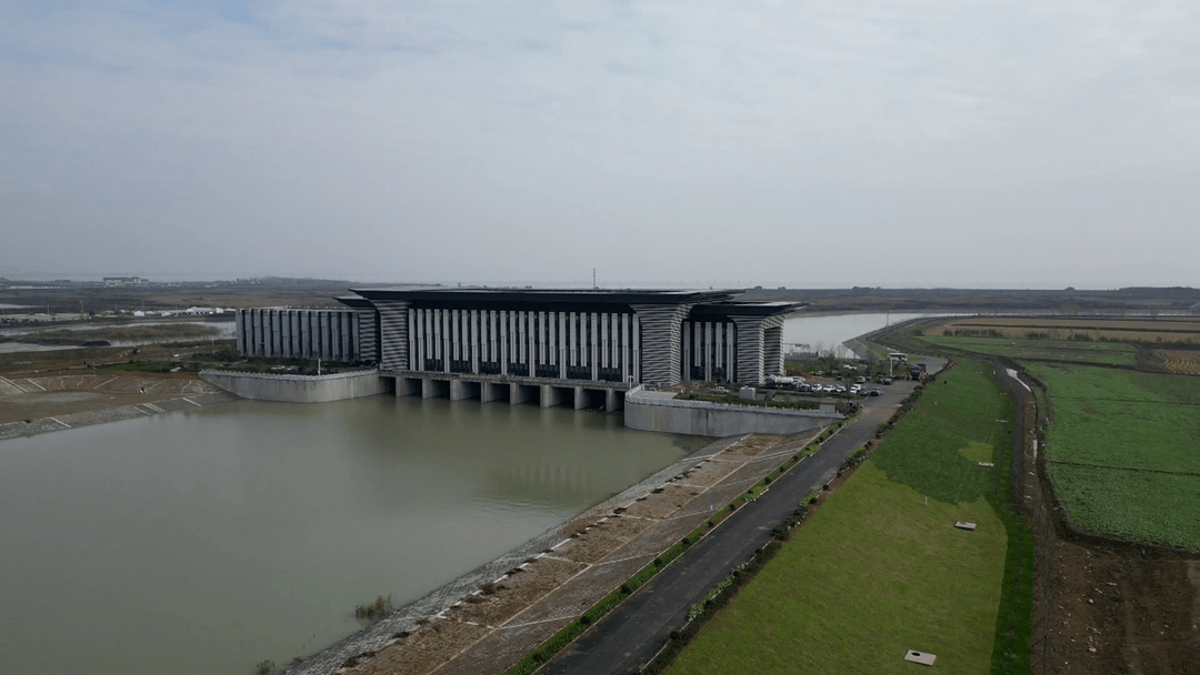 該工程位于肥西縣嚴(yán)店鎮(zhèn)蓮花村的派河口泵站,整體新中式造型,鋼琴鍵的外形,中國(guó)古建筑飛檐造型,具有騰飛之勢(shì),同時(shí)建筑細(xì)節(jié)吸取音樂符號(hào)以及結(jié)合水紋波動(dòng)的立面肌理,宛如跳動(dòng)的樂章。